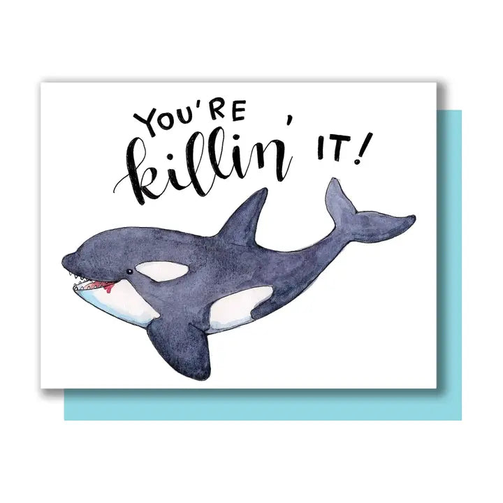 "You're Killin' It!" handlettering with a watercolor illustrated killer whale who has a lil' blood in the corner of its mouth. Great as a congrats, encouragement, or grad card! A2 card with an original watercolor illustration printed on 130 lb paper. Comes with a turquoise deep-flap paper envelope in a protective cellophane sleeve.