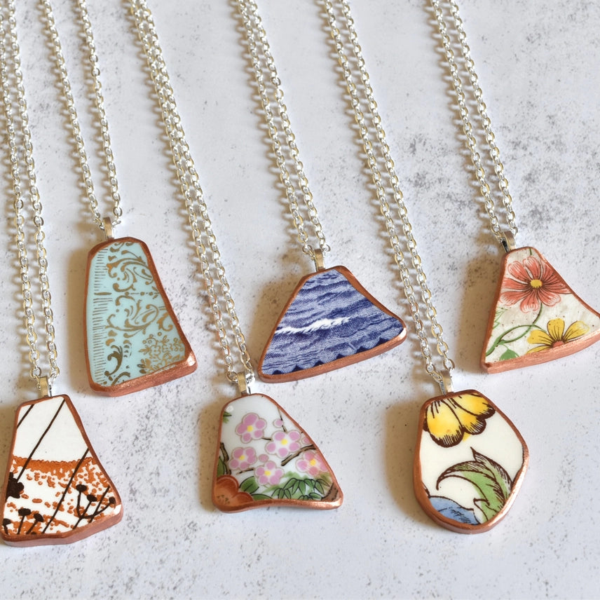 Recycled china shard with gold porcelain paint border* Pendants are one of a kind and are approximately 1" x 2" 18" silver plated chain
