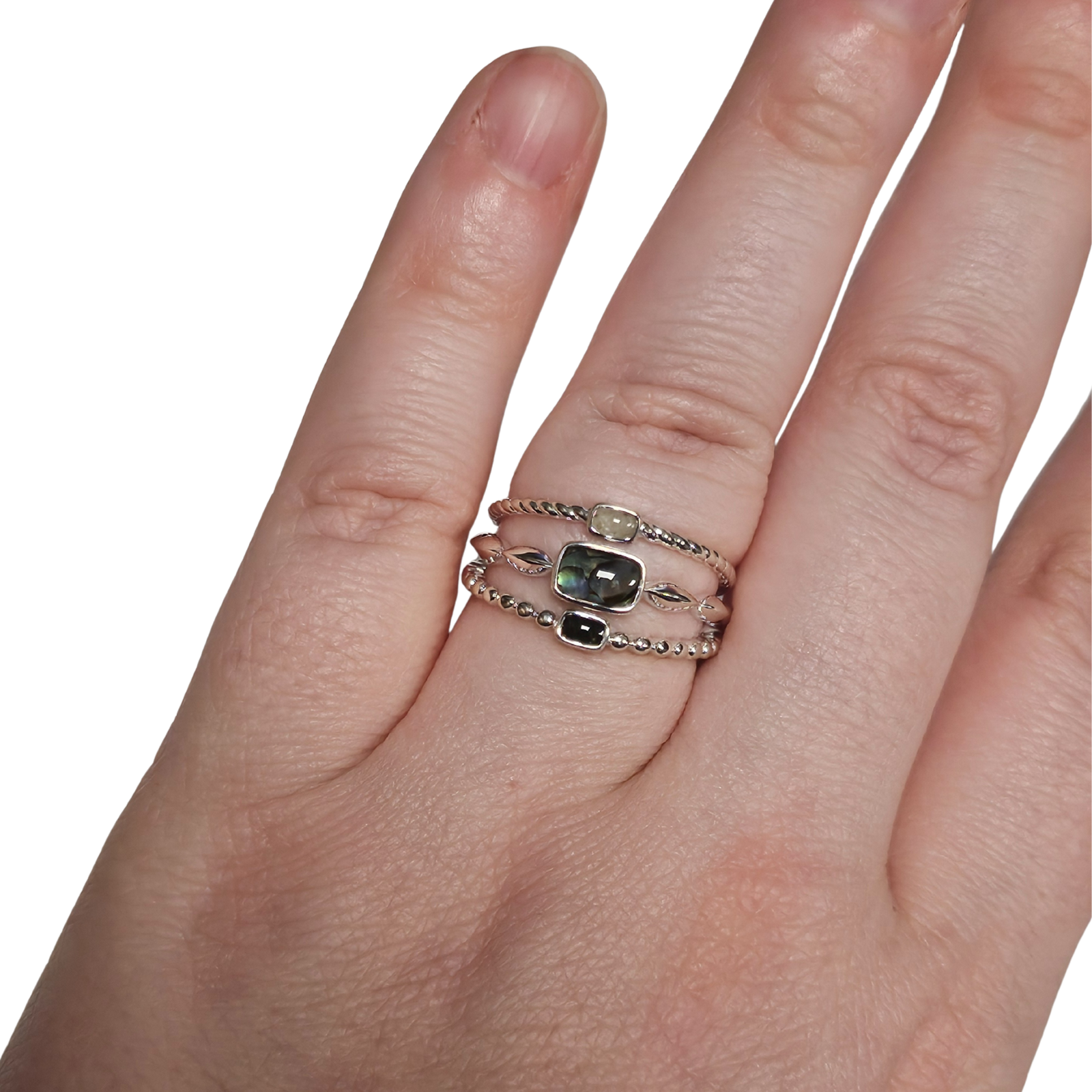 Let your bohemian spirit take you on a new adventure, or three! This Sterling Silver Boho Stack features three interconnected rings with sand from Fogo, South Coast and abalone shell. Each bezel is layered to a slightly domed, glass-like finish.