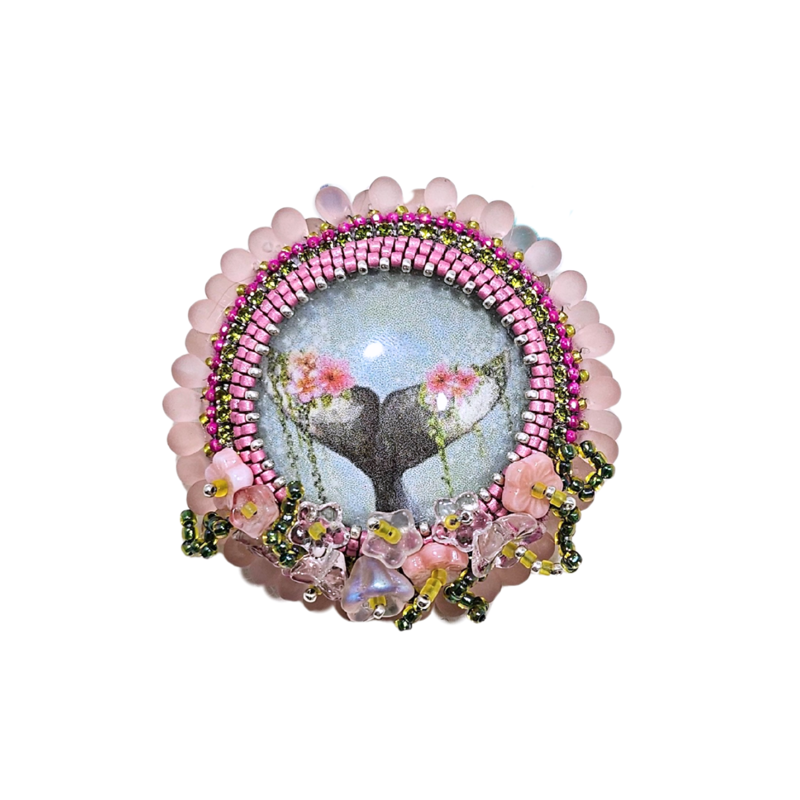 Handcrafted by artist Lynn Hahn, this multifunctional creation makes a beautiful ornament, pendant, or even has a pin to be worn as a broach.
