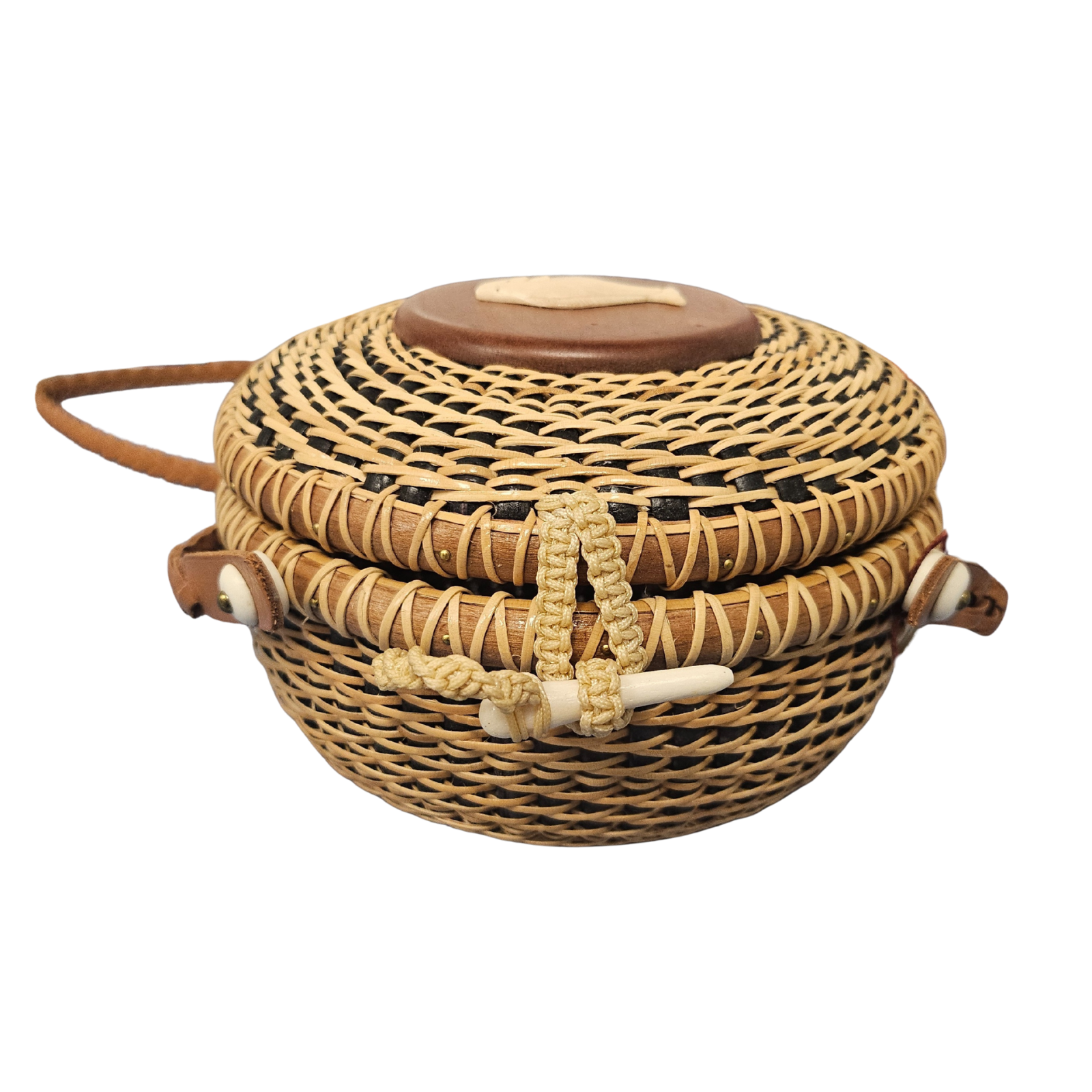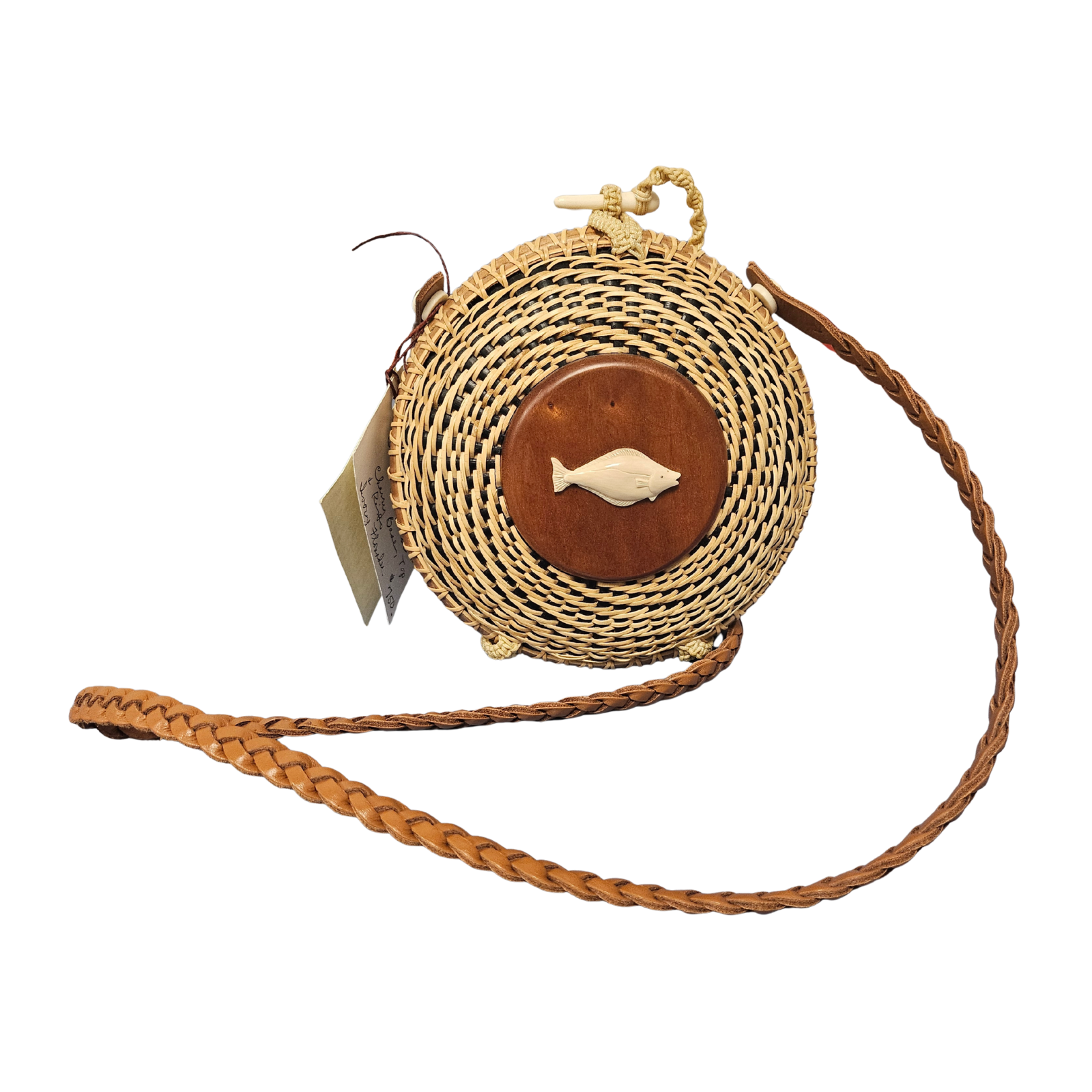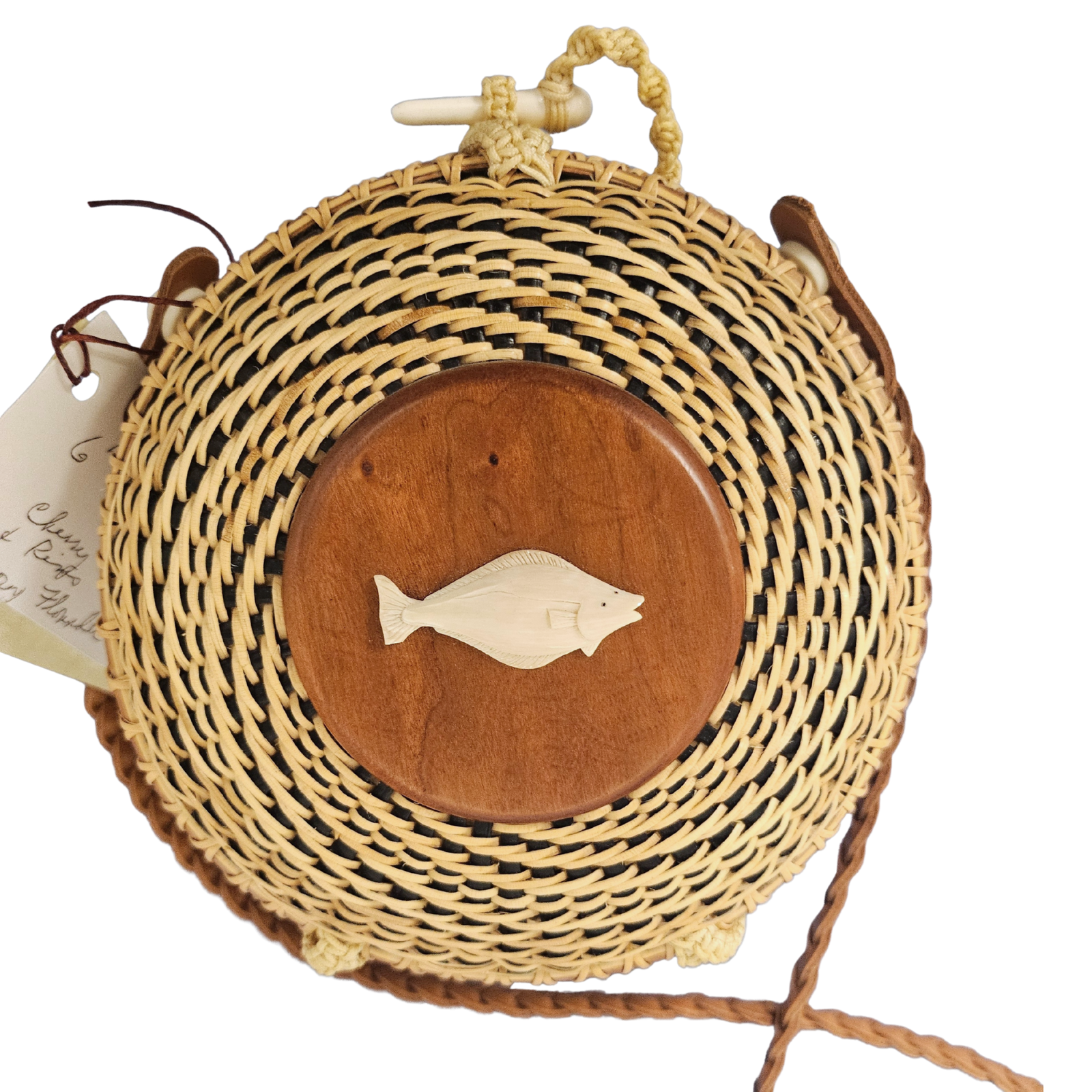 This hand-woven, one-of-a-kind purse is woven with the same traditional practices of Nantucket baskets. 6" Clam Shell Purse with fish decal. 36" hand-woven leather strap. Cherry base and top.