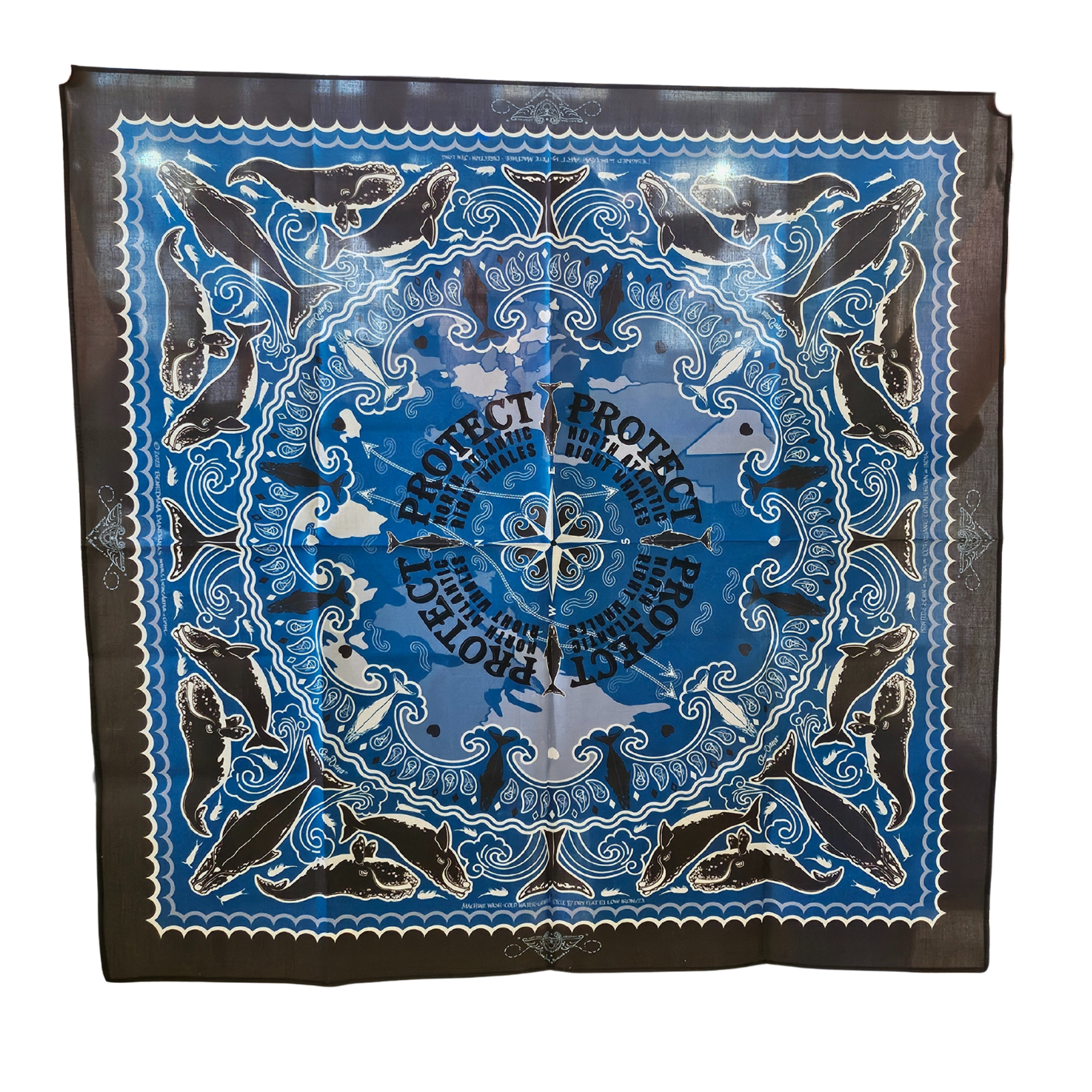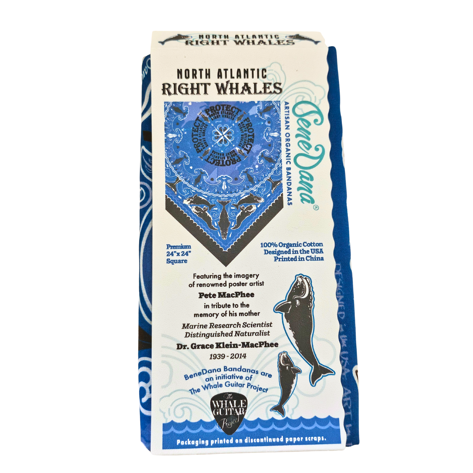 This 100% organic cotton bandana is dedicated to the support of North Atlantic Right Whales. This design by artist Jen Long features the imagery of renowned poster artist Pete MacPhee, in tribute to his late mother, Marine Scientist & distinguished naturalist Dr. Grace Klein-MacPhee.