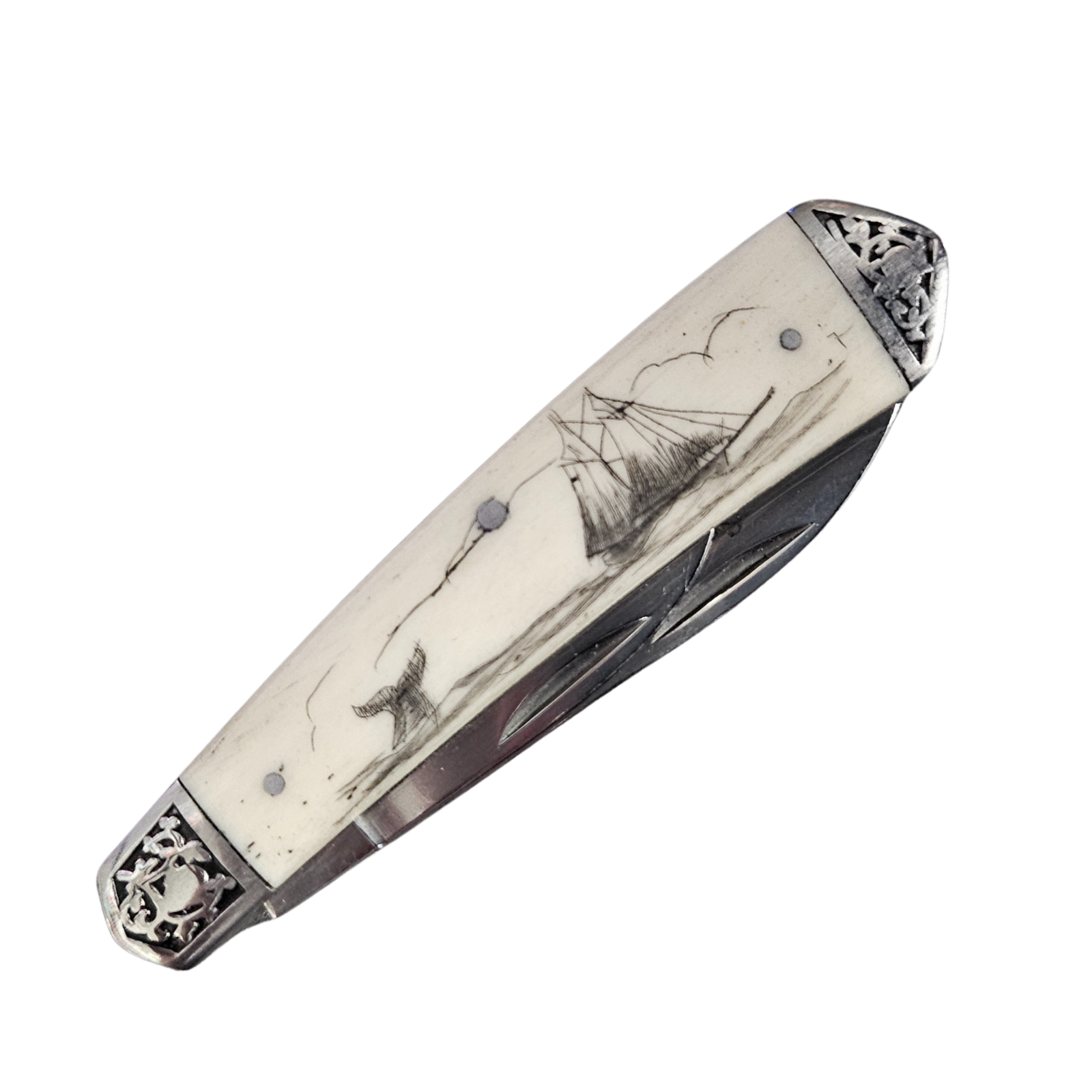 These stunning scrimshaw-inspired knives are all hand etched by local artisans and feature varying whale or nautical themed designs. Each knife is hand etched and made with Bovine Bone, india ink, and sealed with a renaissance wax. These are one of a kind knives. Some designs are horizontal and others are vertical.