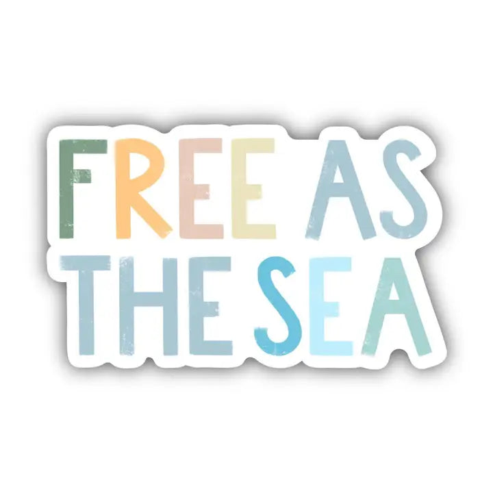 Free As The Sea Positivity Lettering Sticker. Great to decorate water bottles, laptops, phone cases, coolers, car windows, journals, notebooks, planners, bikes, skateboards, kayaks, and more.
